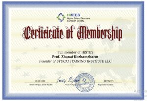 Le professeur Zhanat Kozhamzharov est le fondateur de SYUCAI TRAINING INSTITUTE LLC et membre à part entière de HiSTES (Higher School Teachers European Society). Certification/certification HiSTES HiSTES certifie les programmes de formation et les organisations éducatives conformément aux normes de l’UE. Depuis plus de 20 ans, HiSTES travaille au développement de la coopération entre les établissements d’enseignement supérieur en Europe. Depuis 2015, elle met également en œuvre ses programmes dans les pays de la CEI.