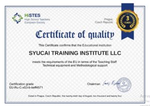 Ce certificat confirme que l’institut de formation SYUCAI TRAINING INSTITUTE LLC répond aux exigences de l’UE en termes de personnel enseignant, d’équipement technique et de soutien méthodologique,